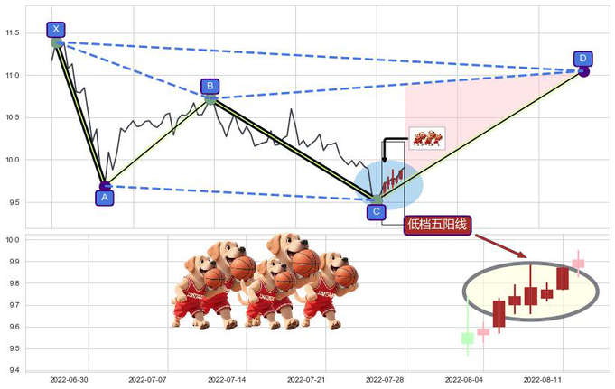 ➢ 低档五阳线 🔜 谐波赛福下沉击穿c上涨拐点 综合量化分数:56.84 【偏多】