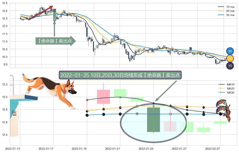形态多维评估: ⚀ 2022-01-25日显现 10日-20日-30日均线 【绝命跳】卖出点 看空信号,后市看跌,卖出