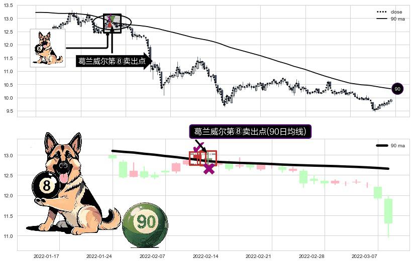 形态多维评估: ⚀ 2022-02-11-日显现 葛兰威尔均线 90日均线 第⑧卖出点 下降趋势的中继信号,后市看跌,卖出信号