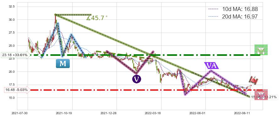 ♘ 阻力价格位23.18,可信任强度92.81%,距离最后交易2022-08-12形成的收盘价格17.35相差 +33.61%