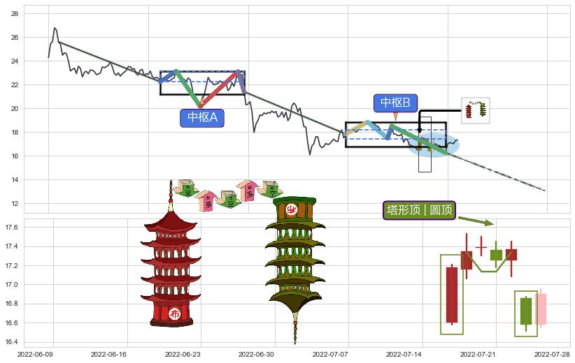 ➣ 【中枢B】:2022-05-25-2022-08-04,中枢由5笔构成,共51交易日, ZG=18.52, ZD=17.85