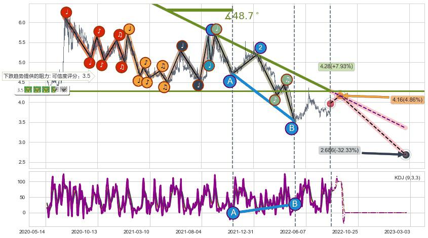 ♘ 阻力价格位4.39,可信任强度88.71%,距离最后交易2022-08-12形成的收盘价格3.970相差 +10.70%