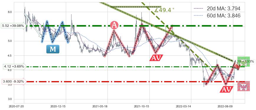 ♘ 阻力价格位4.12,可信任强度60.75%,距离最后交易2022-08-12形成的收盘价格3.970相差 +3.69%