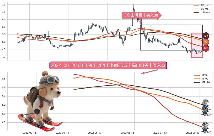 ⚀ 2022-04-19日-2022-08-12日显现 60日-90日-120日均线 【高山滑雪】买入点 看多信号,后市看涨,买入