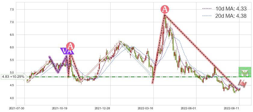 ♘ 阻力价格位4.83,可信任强度50.00%,距离最后交易2022-08-12形成的收盘价格4.38相差 +10.29%