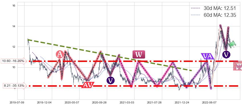 ♘ 支撑价格位10.60,可信任强度88.04%,距离最后交易2022-08-12形成的收盘价格12.65相差 -16.20%