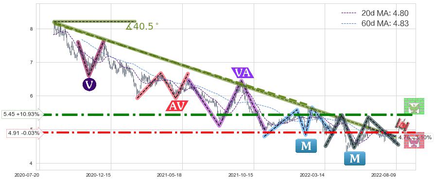 ♘ 阻力价格位5.45,可信任强度92.15%,距离最后交易2022-08-12形成的收盘价格4.91相差 +10.93%