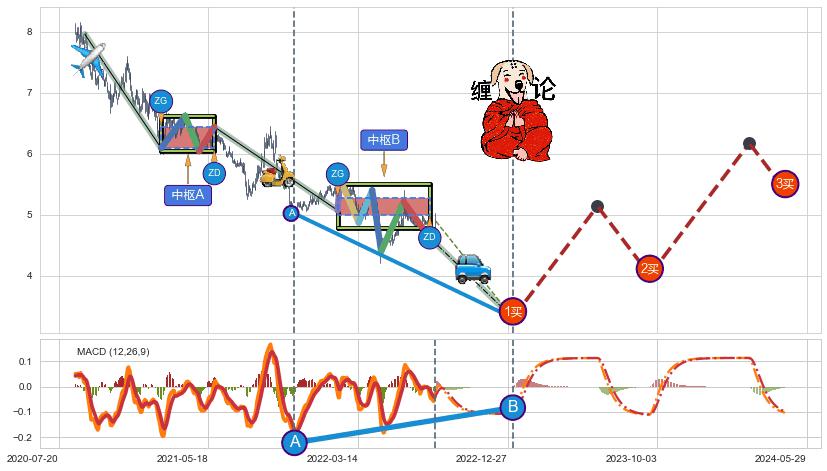 ➣ 【中枢B】:2022-01-27-2022-08-03,中枢由7笔构成,共124交易日, ZG=5.21, ZD=5.07