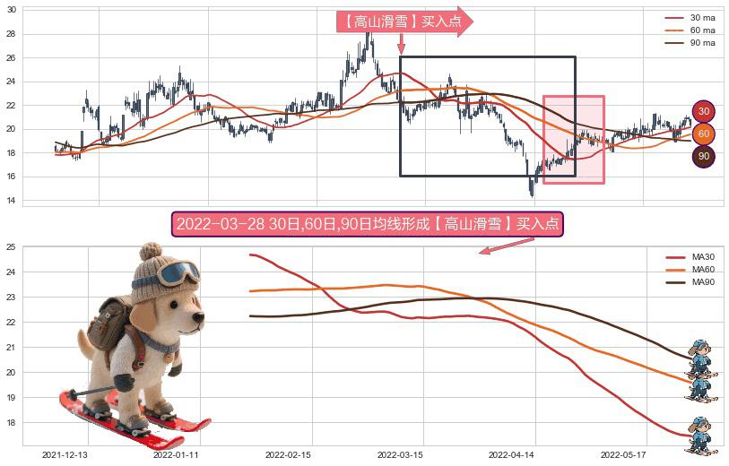 ⚀ 2022-01-24日-2022-05-27日显现 30日-60日-90日均线 【高山滑雪】买入点 看多信号,后市看涨,买入