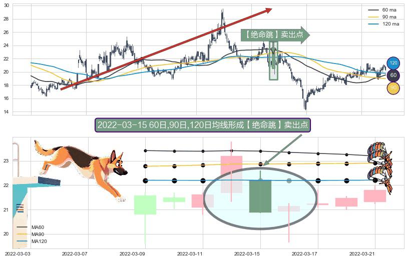 ⚀ 2022-03-15日显现 60日-90日-120日均线 【绝命跳】卖出点 看空信号,后市看跌,卖出