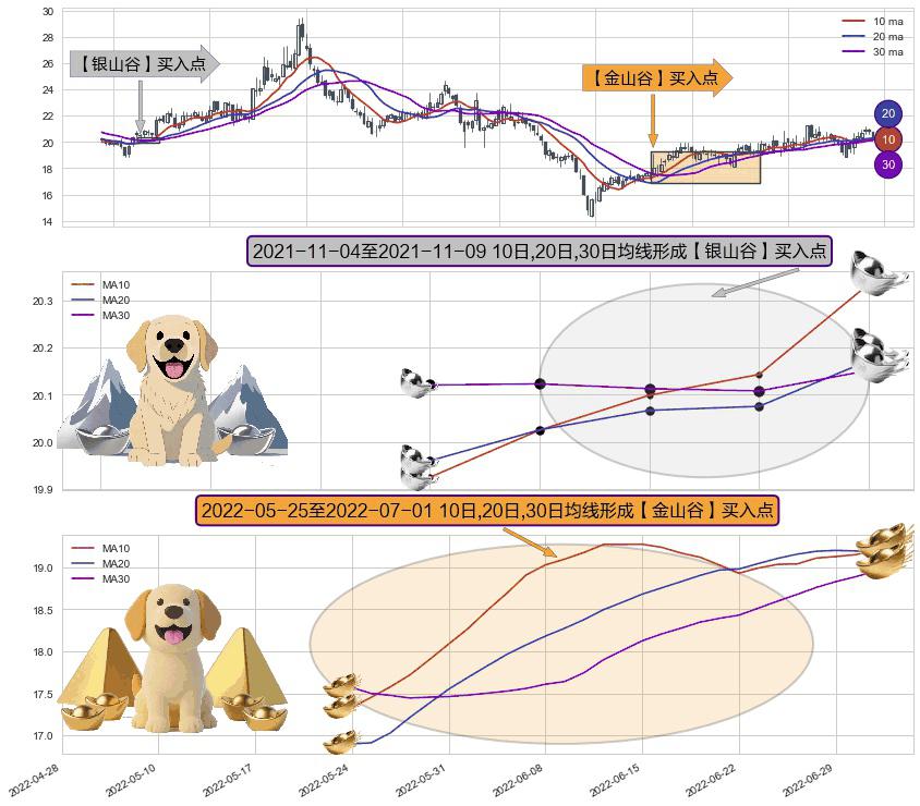 ⚂ 2022-05-26-日至2022-07-01-日显现 10日-20日-30日均线 【金山谷】买入点 其再次确认了买入信号,可靠性更强,买入