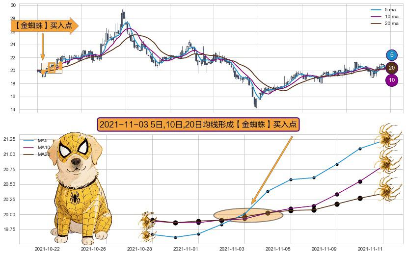 ⚀ 2021-11-03日显现 5日-10日-20日均线 【金蜘蛛】买入点 看多信号,后市看涨,买入