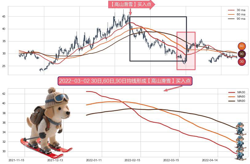 形态多维评估: ⚀ 2021-12-29日-2022-04-28日显现 30日-60日-90日均线 【高山滑雪】买入点 看多信号,后市看涨,买入