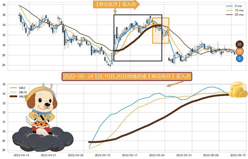 形态多维评估: ⚀ 2022-04-29日-2022-06-13日显现 5日-10日-20日均线 【烘云托月】买入点 看多信号,后市看涨,买入