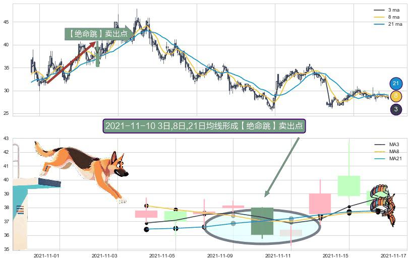形态多维评估: ⚀ 2021-11-10日显现 3日-8日-21日均线 【绝命跳】卖出点 看空信号,后市看跌,卖出