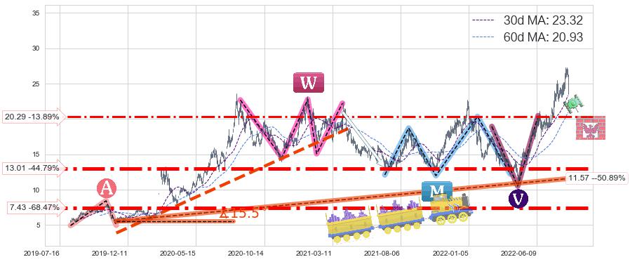 ♘ 支撑价格位20.29,可信任强度67.77%,距离最后交易2022-08-12形成的收盘价格23.56相差 -13.89%
