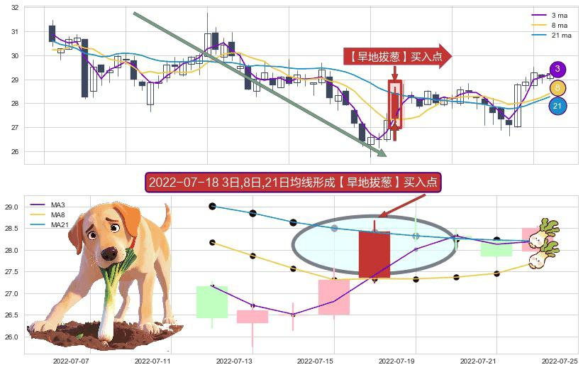 ⚀ 2022-07-18日显现 3日-8日-21日均线 【旱地拔葱】买入点 看多信号,后市看涨,买入