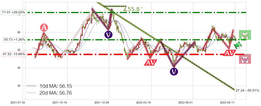 ♘ 阻力价格位55.73,可信任强度80.24%,距离最后交易2022-08-12形成的收盘价格55.04相差 +1.26%