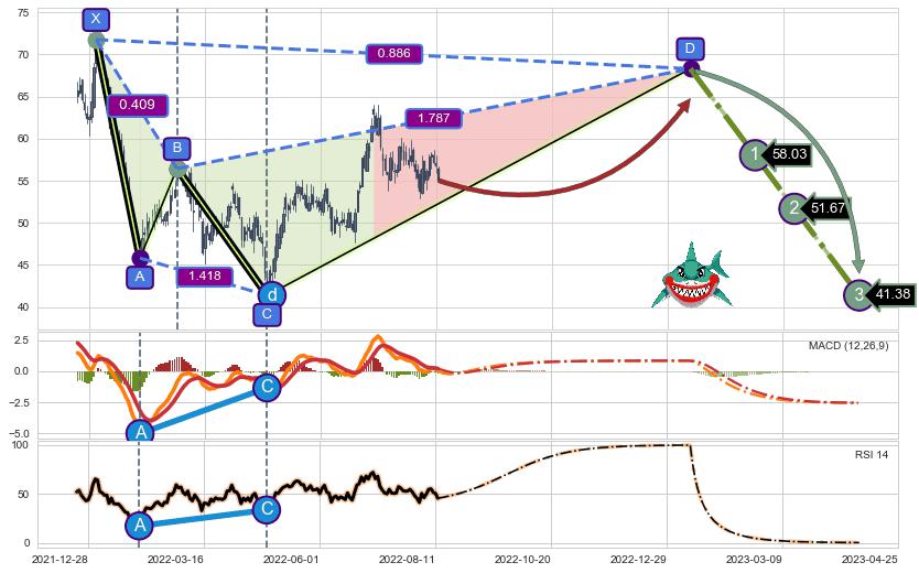 ➣ 未完成【鲨鱼】形态起点X: 2021-12-31, 已到达C点: 2022-04-26, 预测最终D点: 2023-01-12, 共230交易日