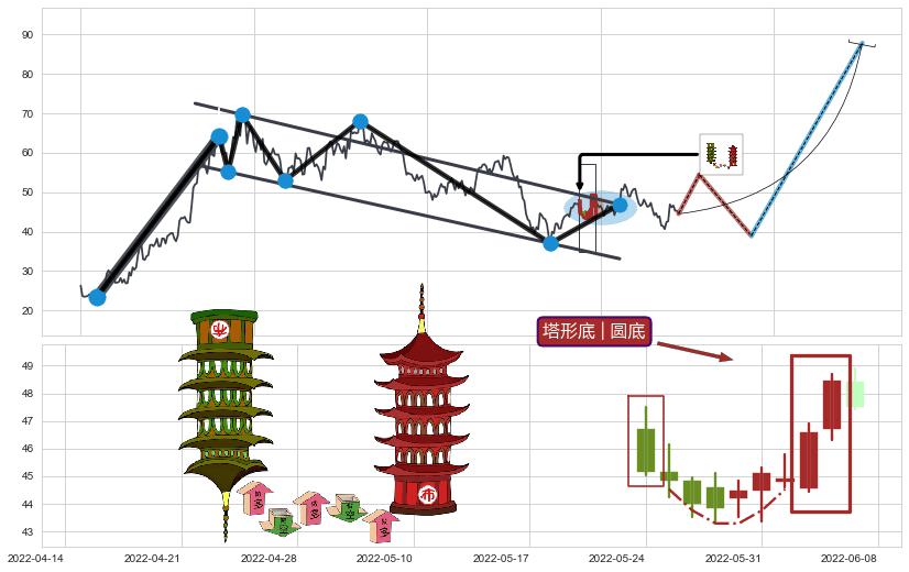 | 13 🅚:塔形顶 | 圆顶 ➕ 📐:扩散三角反转猜想突破点临近,临近关键支撑位,预期下沉突破下跌 ☞ 看空信号 ⇥ 【🅚线】交织【图形】⇥ 综合量化分数: 47 | > |
