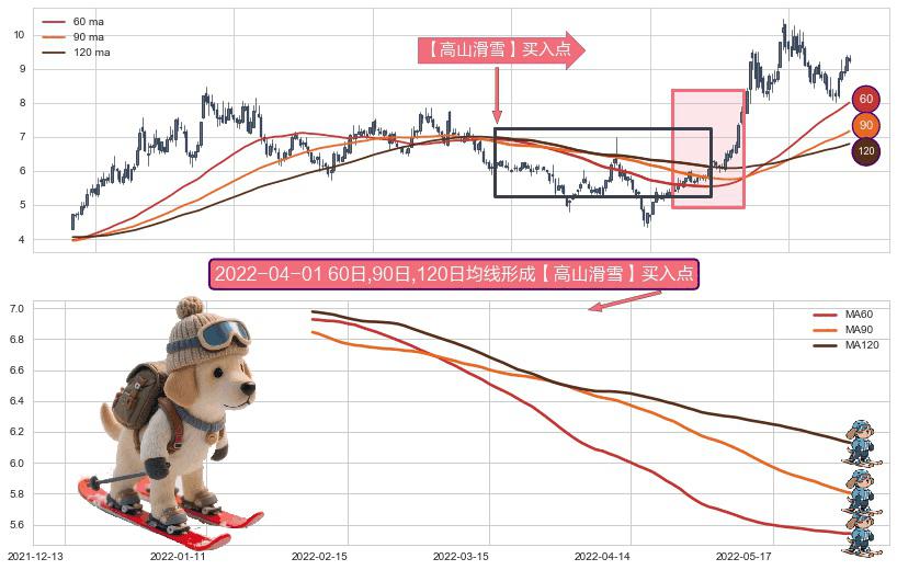 形态多维评估: ⚀ 2022-02-08日-2022-06-01日显现 60日-90日-120日均线 【高山滑雪】买入点 看多信号,后市看涨,买入