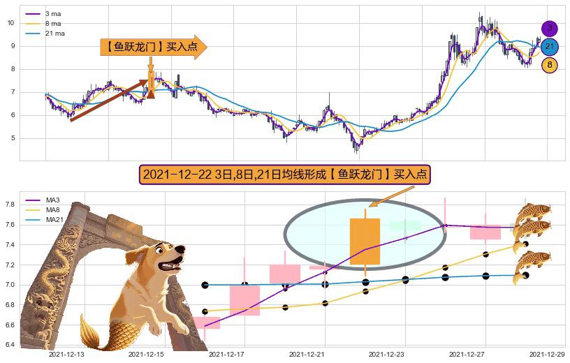 形态多维评估: ⚀ 2021-12-22日显现 3日-8日-21日均线 【鱼跃龙门】买入点 看多信号,后市看涨,买入