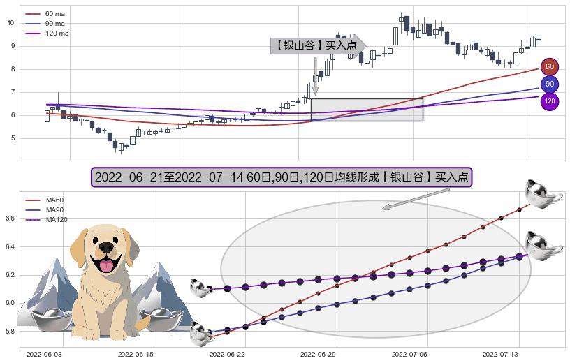 形态多维评估: ⚀ 2022-06-22-日至2022-07-14-日显现 60日-90日-120日均线 【银山谷】买入点 看多信号,后市看涨,买入