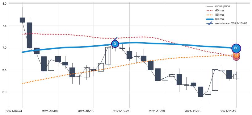 下跌趋势2021-12-20-2022-05-19,均线40, 85确认关键阻力2处