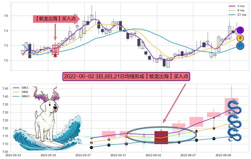 形态多维评估: ⚀ 2022-06-02日显现 3日-8日-21日均线 【蛟龙出海】买入点 看多信号,后市看涨,买入