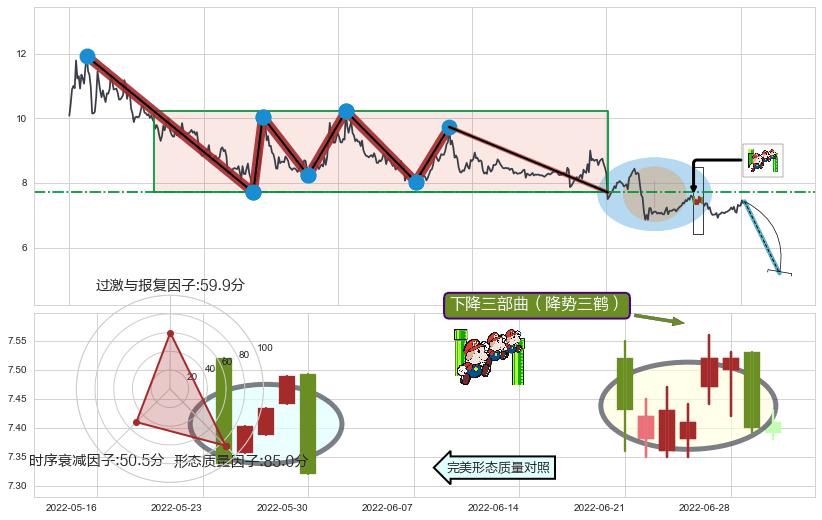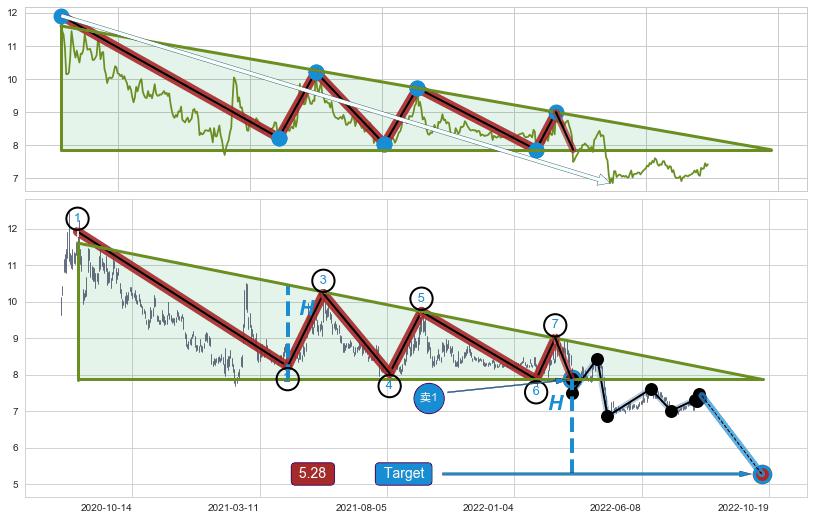 ➢ 【多方力量耗尽,空方打破攻守平衡点】下降三角形中继整理, 已在2022-03-15突破【支撑】颈线 7.87 →演变成下降通道