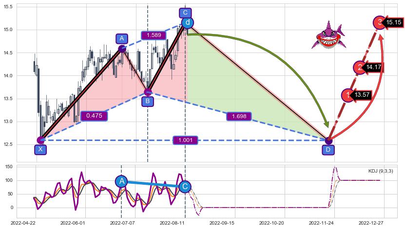 ➣ 未完成【鲨鱼】形态起点X: 2022-04-26, 已到达C点: 2022-08-11, 预测最终D点: 2022-11-21, 共146交易日
