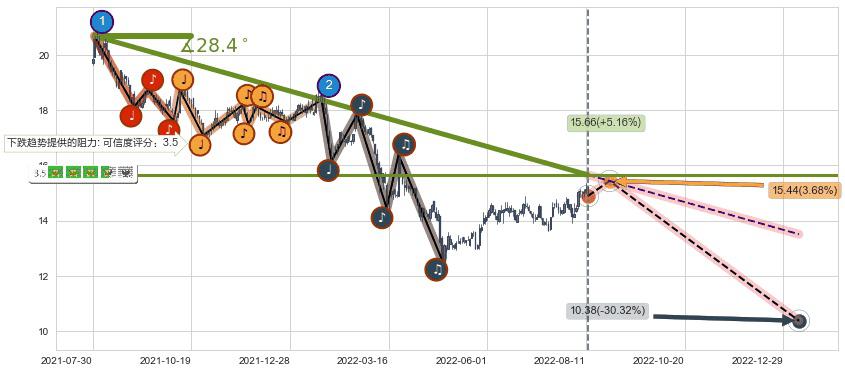 ♘ 在最后的下跌阶段2021-08-02至2022-05-23,存在 持续未破位的阻力位 ,阻力价格15.66,可信任强度79.74%,其距离最后价格14.89相差 +5.16%