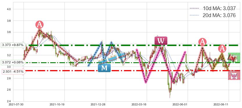 ♘ 阻力价格位3.373,可信任强度88.64%,距离最后交易2022-08-12形成的收盘价格3.070相差 +9.87%