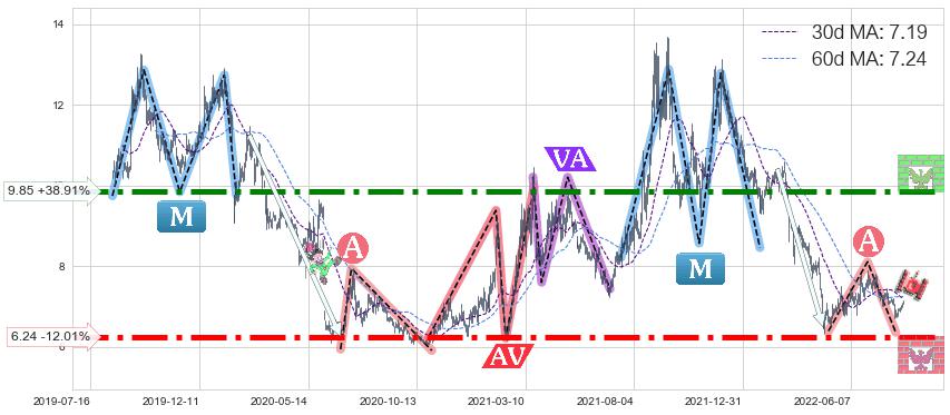 ♘ 支撑价格位6.24,可信任强度98.11%,距离最后交易2022-08-12形成的收盘价格7.09相差 -12.01%