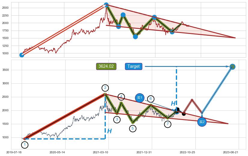 ➢ 最小中继整理涨幅→𝐇: 1658.57 (𝐇楔型旗杆的长度:楔型起点→顶点)