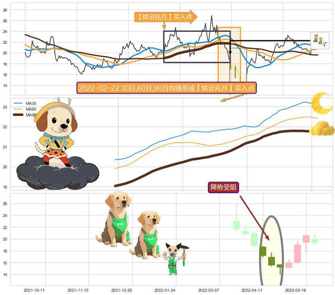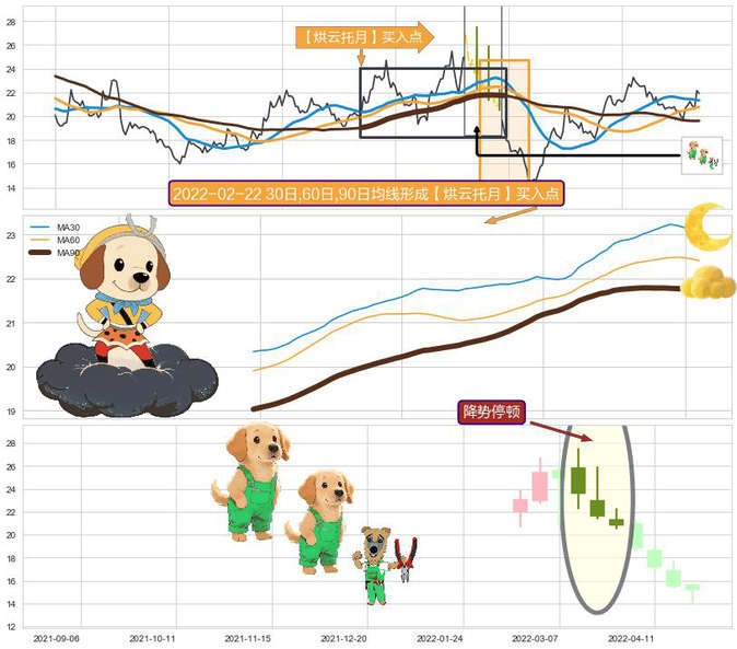 ➢ 【烘云托月】买入点:猜想持续上涨 → 多头排列 → 中短均线纠缠粘合 → 长均线托举中短均线 → 中继信号 → 烘云托月买入点