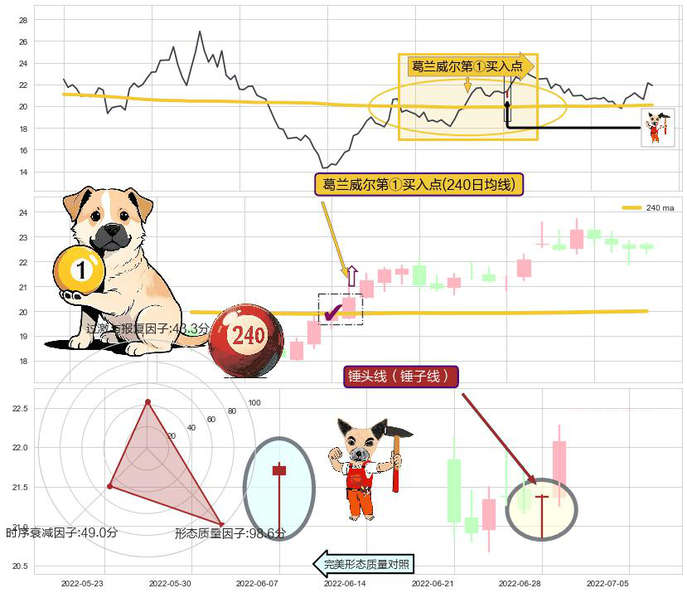 ➣ 锤头线(锤子线) + 葛兰威尔第①买入点葛兰威①买:趋势逆转拐点信号叠加后【目标达成率】低,【看多】信号叠加【存续影响大】