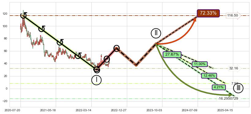 ➣ D点拟合预测价格59.76,距离最后交易收盘价格41.20相差 +45.04%