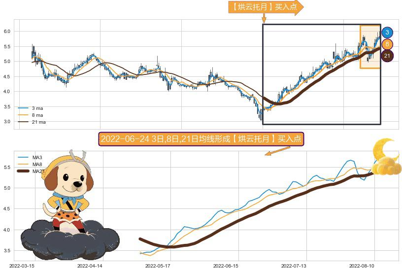形态多维评估: ⚀ 2022-04-29日-2022-08-12日显现 3日-8日-21日均线 【烘云托月】买入点 看多信号,后市看涨,买入