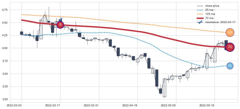 下跌趋势2022-03-03-2022-05-24,均线70确认关键阻力1处