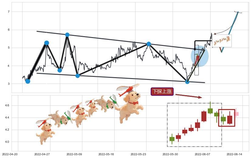 ➢ 低点影线(2022-07-06: 4.89 )→回踩→第二根k线低点(2022-07-05: 5.06 )