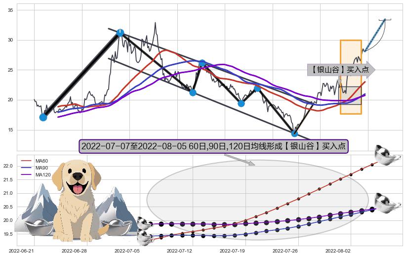 | 5 🅚:【银山谷】买入点 ➕ 🌊:波浪理论即将到达C点,猜想随后C点击穿突破, 下跌5浪延续反弹趋势,猜想持续蓄力反弹abc上涨方向(大周期趋势均值回复后小周期持续趋势跟踪) ☞ 看多信号 ⇥ 【均线】交织【图形】⇥ 综合量化分数: 75 | > |