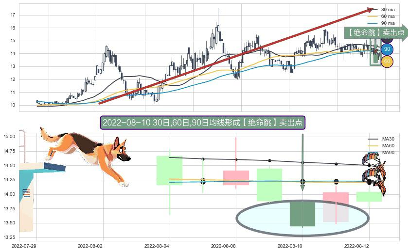 形态多维评估: ⚀ 2022-08-10日显现 30日-60日-90日均线 【绝命跳】卖出点 看空信号,后市看跌,卖出