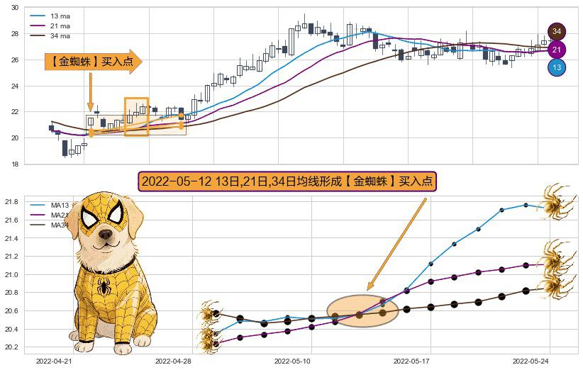 ⚀ 2022-05-12日显现 13日-21日-34日均线 【金蜘蛛】买入点 看多信号,后市看涨,买入