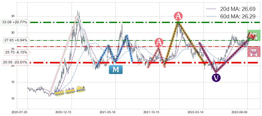 ♘ 阻力价格位27.65,可信任强度50.05%,距离最后交易2022-08-12形成的收盘价格27.39相差 +0.94%