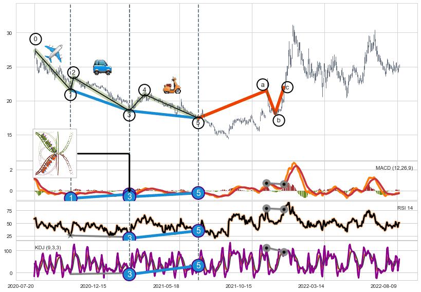 ➢ 1,3,5驱动浪MACD, RSI, KDJ走势都出现【常规背离】反转信号增强