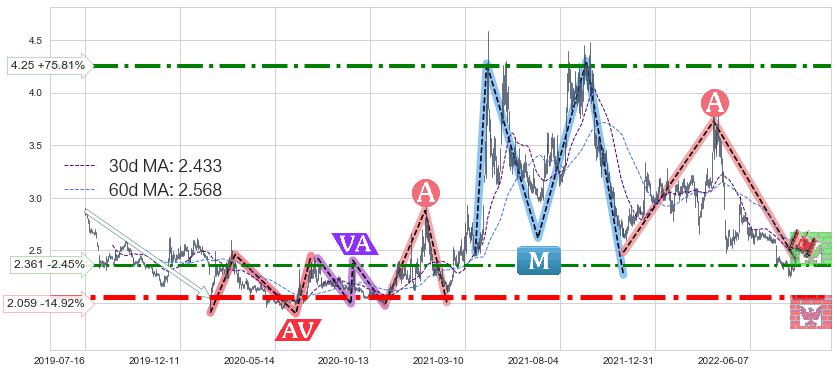 ♘ 阻力价格位2.361,可信任强度60.44%,距离最后交易2022-08-12形成的收盘价格2.420相差 -2.45%
