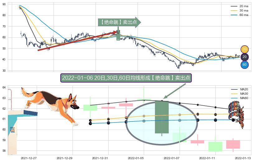 ⚀ 2022-01-06日显现 20日-30日-60日均线 【绝命跳】卖出点 看空信号,后市看跌,卖出