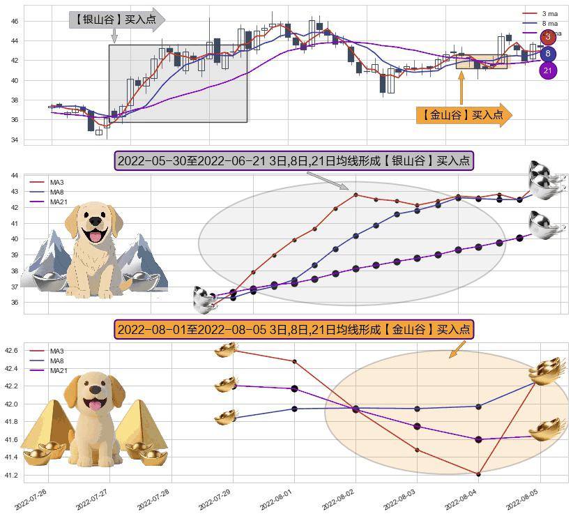 ⚃ 2022-08-02-日至2022-08-05-日显现 3日-8日-21日均线 【金山谷】买入点 其再次确认了买入信号,可靠性更强,买入