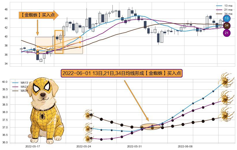 ⚀ 2022-06-01日显现 13日-21日-34日均线 【金蜘蛛】买入点 看多信号,后市看涨,买入